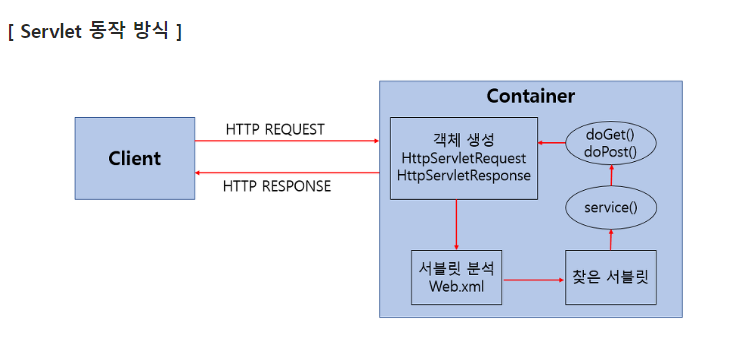 - 클라이언트의 요청에 대해 동적으로 작동하는 웹 어플리케이션 컴포넌트