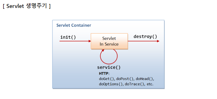 - 클라이언트의 요청이 들어오면 컨테이너는 해당 서블릿이 메모리에 있는지 확인하고, 없을 경우 init()메소드를 호출하여 적재.